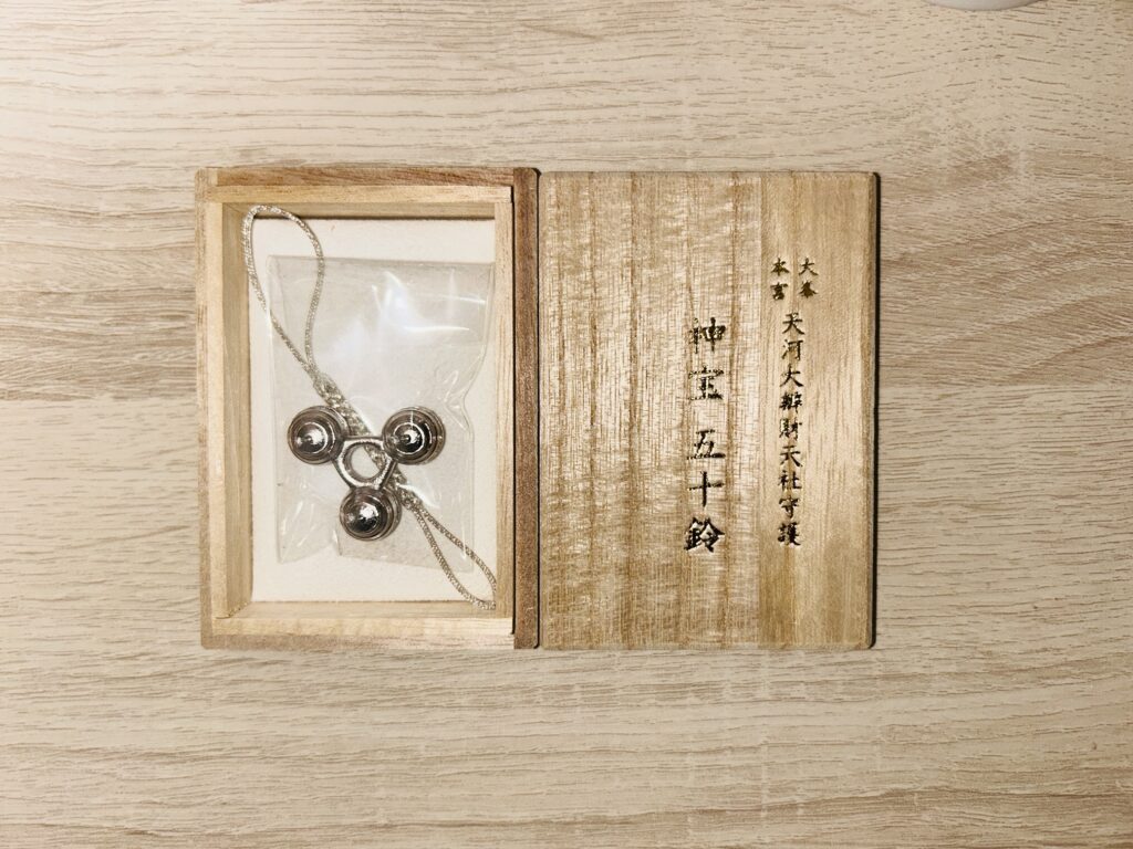 あと授与品で神宝五十鈴というものがあります。これも事前に予約をしておいて、一緒にお祓いをしてもらい、御祈祷の後でいただきました。